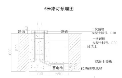 4)、澆筑路燈基礎預埋件:在開挖的1米深的坑中,把凱創(chuàng)光電預先焊接的預埋件放置到坑中,并將鋼絲管放到預埋件正中間,另放到埋放蓄電池處。并保持預埋件、地基與地面在同個水平面上。然后用C20混凝土對預埋件進行澆筑固定。澆筑過程中不斷攪拌勻稱,以保證整個預埋件的密實性和牢固性。
